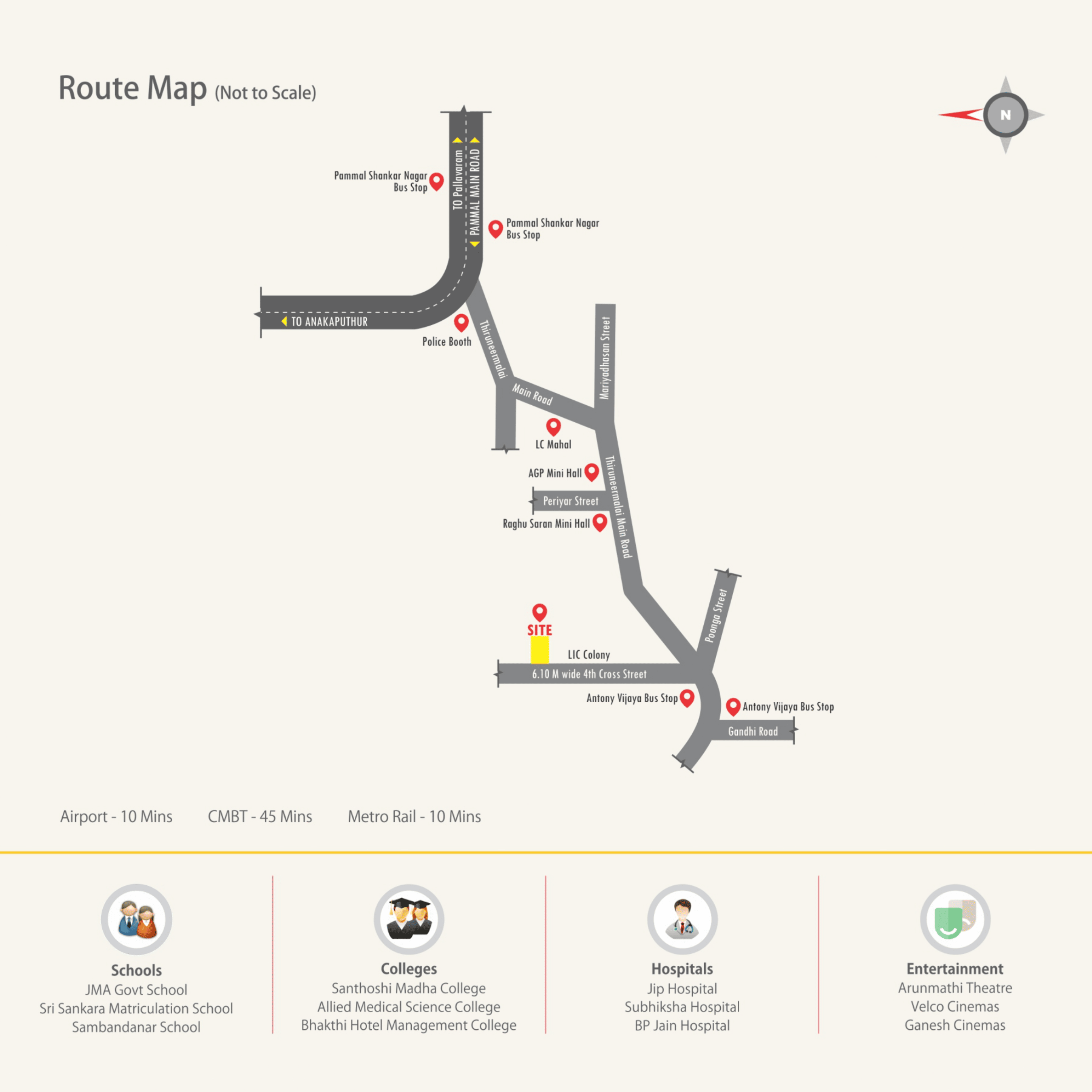 It enjoys a strategic location with many reputed and multispeciality hospitals nearby like Govt. Primary health care center Polichalur, Shakthi Well Women and Family Clinic, and Deepam Hospital Ltd - Hospital in Pallavaram. The city's best schools like Peace On Green Earth Public School, Lalaji Memorial Omega International School, and Kaduvizhi Siddha Yoga Centre are also near this housing project.